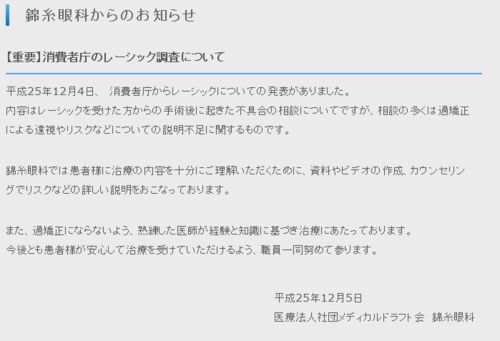 久々に長いです。ほぼ協力者にまとめて貰って楽なこと楽なこと…。消費者庁の発表に即座に反応したのは自分が確認したところで安心レーシックネットワークだと記憶しています。しかし、後遺症でいまなお苦しんで、安心レーシックネットワーク施設複数でも診察…